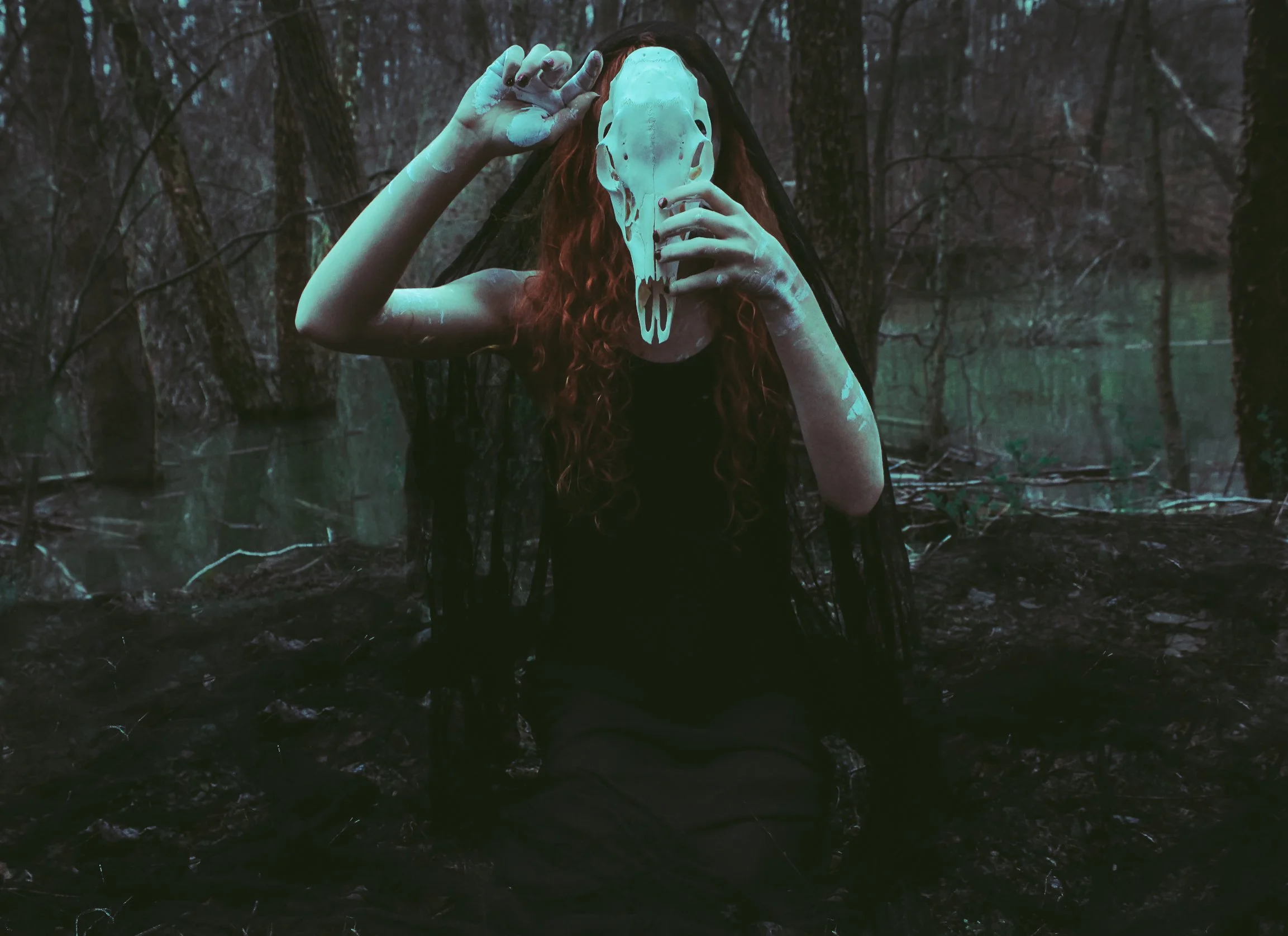 A person with long red hair wearing a black dress, sitting on the ground in a dark, wooded area, holding a white animal skull mask in front of their face.