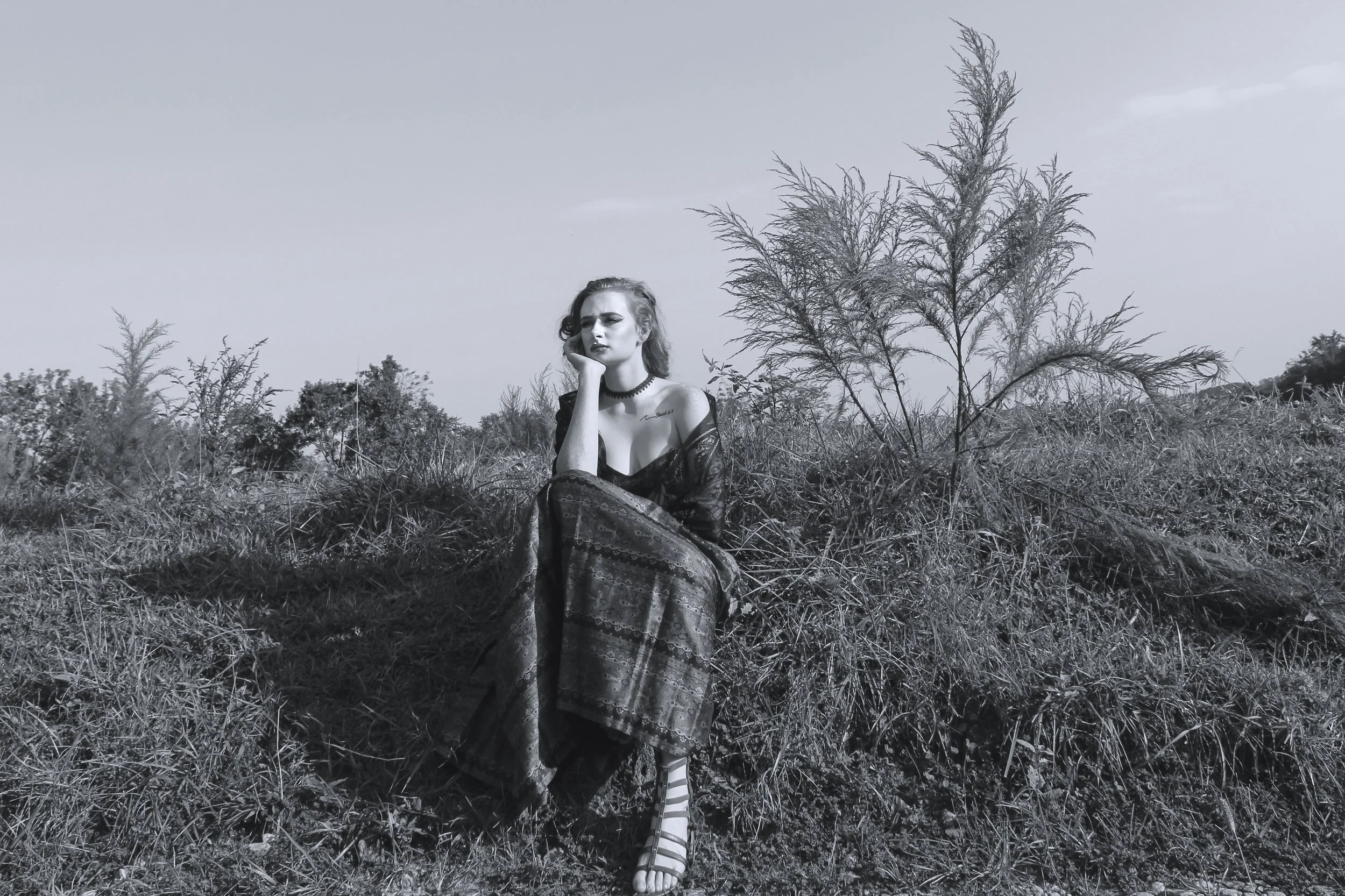 A woman sitting on a grassy hill with tall plants around her, looking contemplative with her hand resting on her face, in an outdoor natural setting.