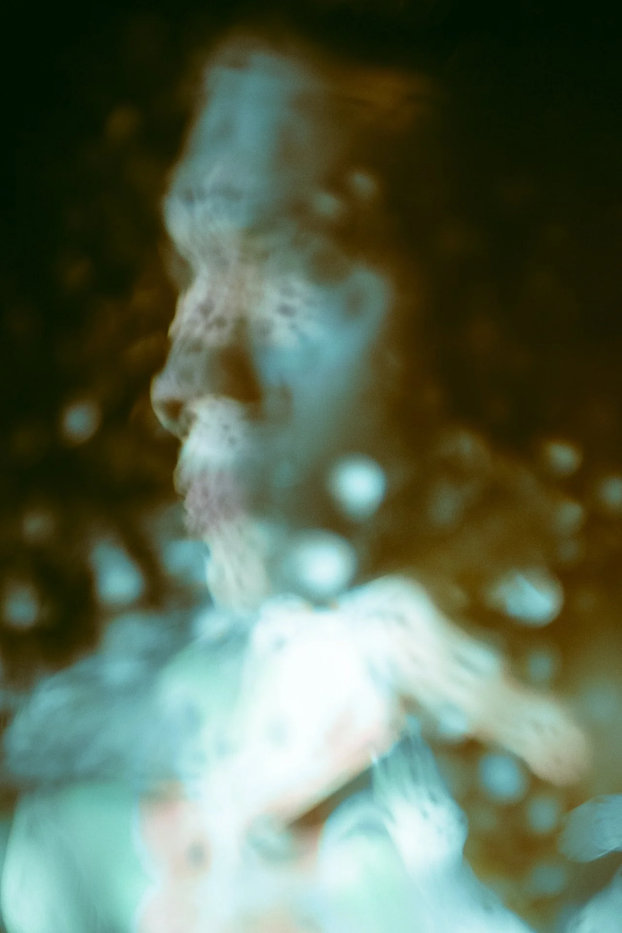 A blurry, abstract image of a woman's profile with curly hair, with light and bokeh effects.