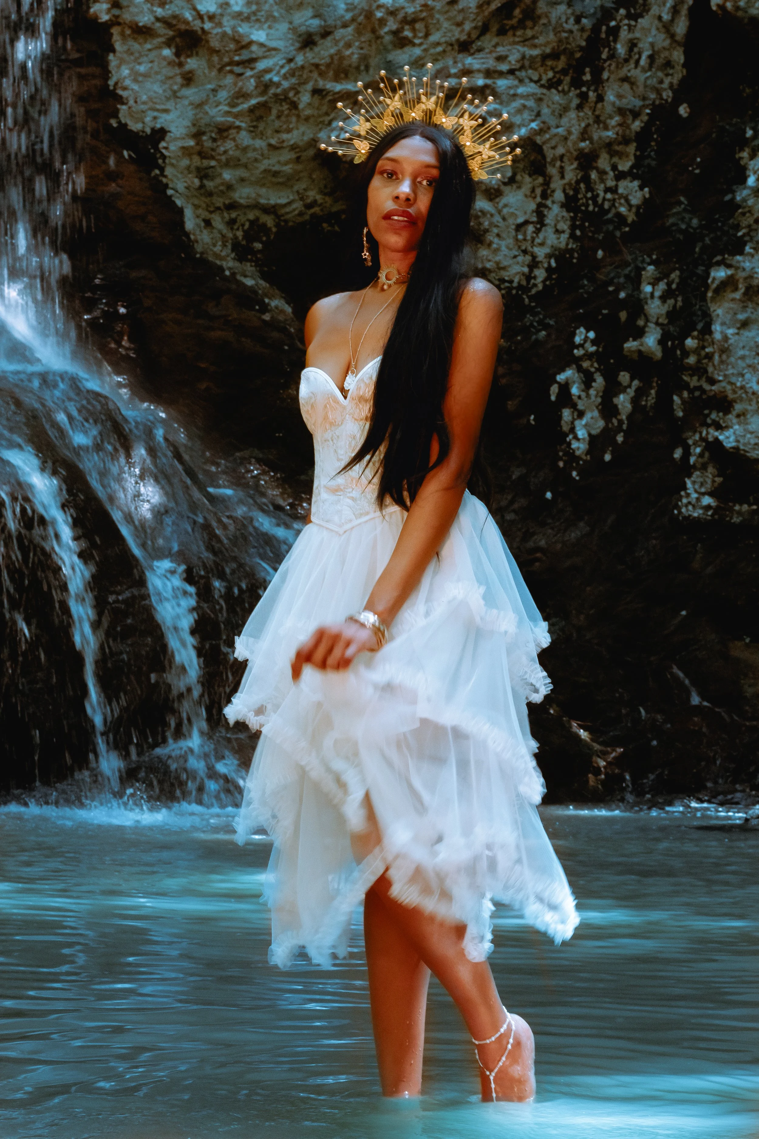 A woman dressed in a white gown standing in water with a waterfall behind her, wearing a gold crown and jewelry.