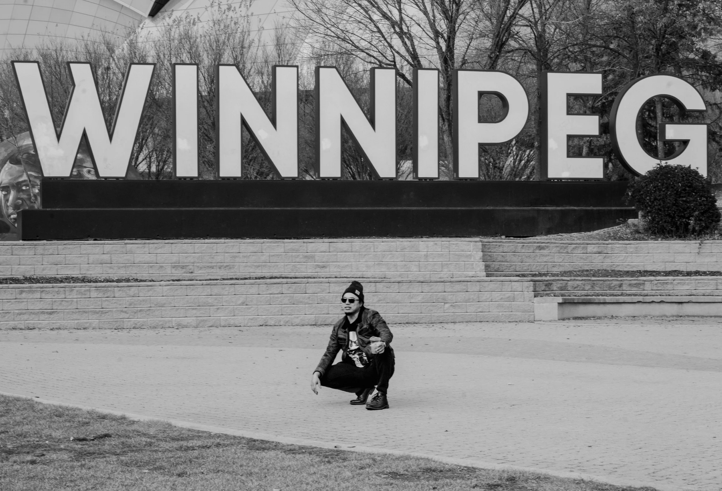 A person crouching in front of a large sign that reads 'WINNIPEG' in an outdoor setting with trees in the background. The person is wearing sunglasses, a patterned jacket, black pants, and boots, and is holding a drink in one hand.