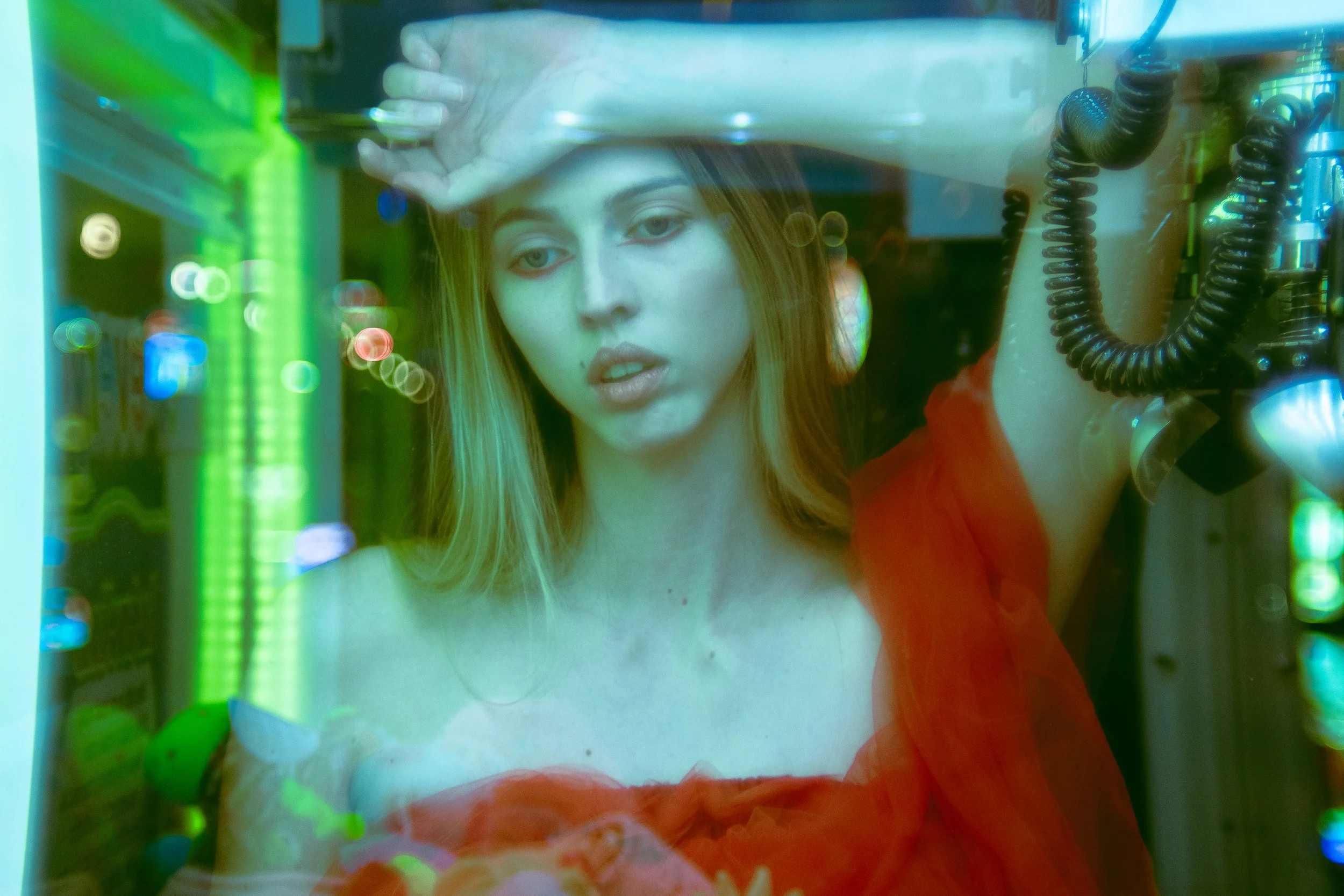A woman with long hair, eyes closed, pressing her face against a glass surface illuminated by red lights. She is wearing a polka dot scarf or garment.